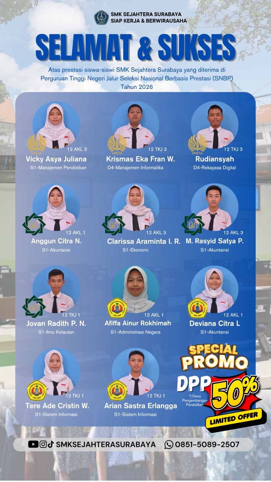 Saya sangat bersyukur pernah menempuh pendidikan di SMK Sejahtera Surabaya. Selama sekolah, saya tidak hanya mendapat ilmu teori, tetapi juga keterampilan praktik yang sangat berguna di dunia kerja. Ketika saya magang di PT Bambang Djaja, semua bekal yang saya pelajari di sekolah benar-benar terasa manfaatnya. Alhamdulillah, karena performa saya yang dinilai bagus selama magang dan dukungan penuh dari sekolah, saya langsung ditawari menjadi karyawan tetap di perusahaan tersebut. Terima kasih SMK Sejahtera Surabaya yang telah membimbing saya hingga bisa meraih karier lebih awal!